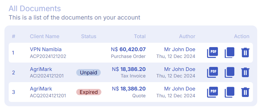 View all the documents you created, download them as PDF documents in one click.